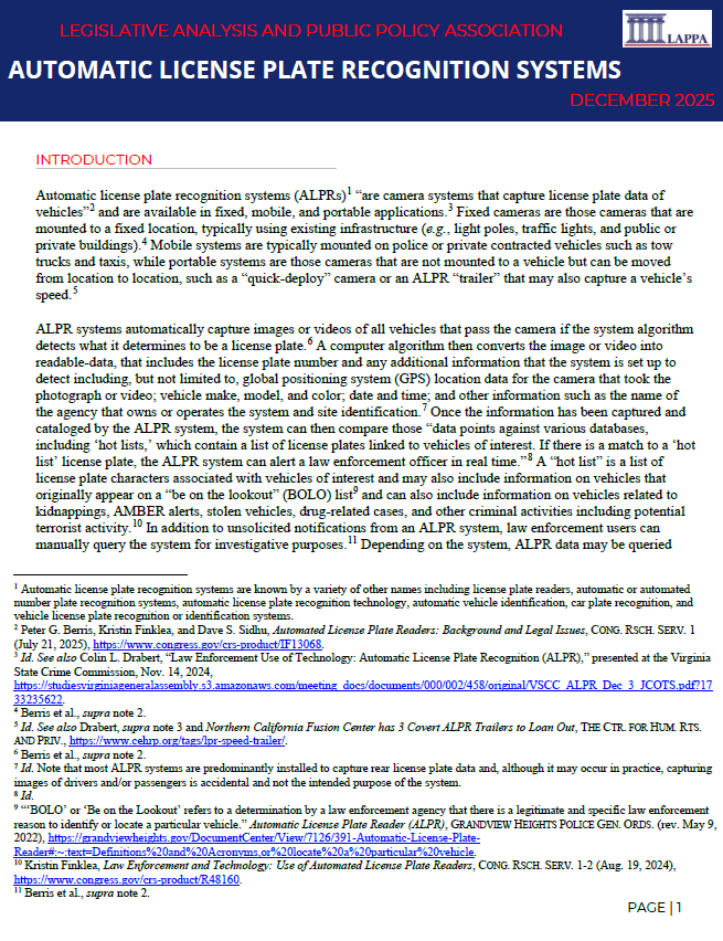 Automatic license plate recognition systems (ALPRs) are camera systems that capture license plate data of vehicles and are available in fixed, mobile, and portable applications. ALPR systems automatically capture images or videos of all vehicles that pass the camera if the system algorithm detects what it determines to be a license plate. A computer algorithm then converts the image or video into readable-data, that includes the license plate number and any additional information that the system is set up to detect. This data can then be used by law enforcement for a variety of investigative purposes.
