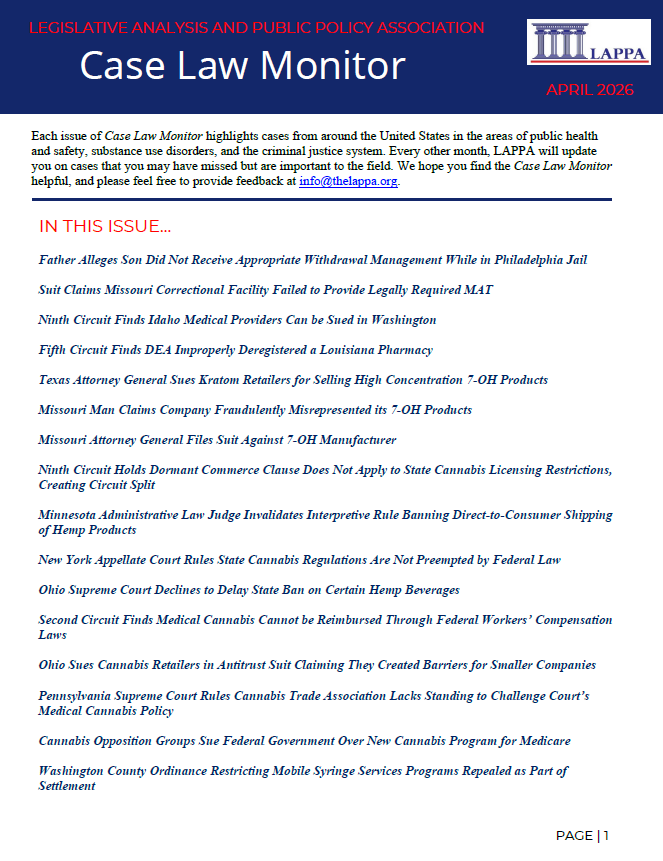 Each issue of Case Law Monitor highlights unique cases from around the United States in the areas of public health and safety, substance use disorder, and the criminal justice system. Every other month, LAPPA updates readers on cases that are important to the field.