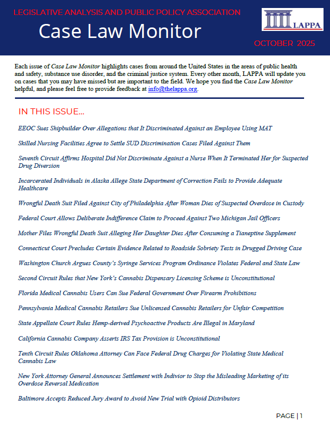 Each issue will highlight unique cases from around the United States in the areas of public health and safety, substance use disorders, and the criminal justice system. Every other month, LAPPA will update you on cases that you may have missed but are important to the field.