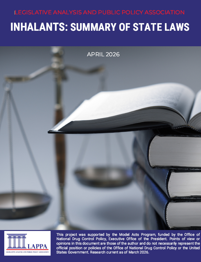Inhalants are substances that produce intoxicating chemical vapors that people inhale. These substances are often found in products that are legal to purchase and use and include common household items like glue, cleaning fluid, spray paint, magic markers, and cooking spray. According to the National Institute on Drug Abuse, there are four categories of inhalants: (1) volatile solvents; (2) aerosols; (3) gases; and (4) nitrites. Inhalants produce vapors that can be inhaled, either directly from open containers or by soaking rags in the substance and then “huffing” the rags. Users can also spray aerosols directly into their noses or mouths or onto pieces of clothing and into a paper or plastic bag, balloons, or other devices known as “snappers” and “poppers” and inhale the fumes. Depending on the substance, inhalants can “produce effects similar to alcohol, sedatives, or the early stages of anesthesia.” Substances can also cause a short feeling of being high or a feeling of light-headedness, distorted vision, or disorganized thinking. As of April 2026, forty-seven states, the District of Columbia, and Guam criminalize the possession and/or use of inhalants with penalties ranging from low-level misdemeanors to low-level felonies, usually for repeat violations. Click here to read the full Summary.